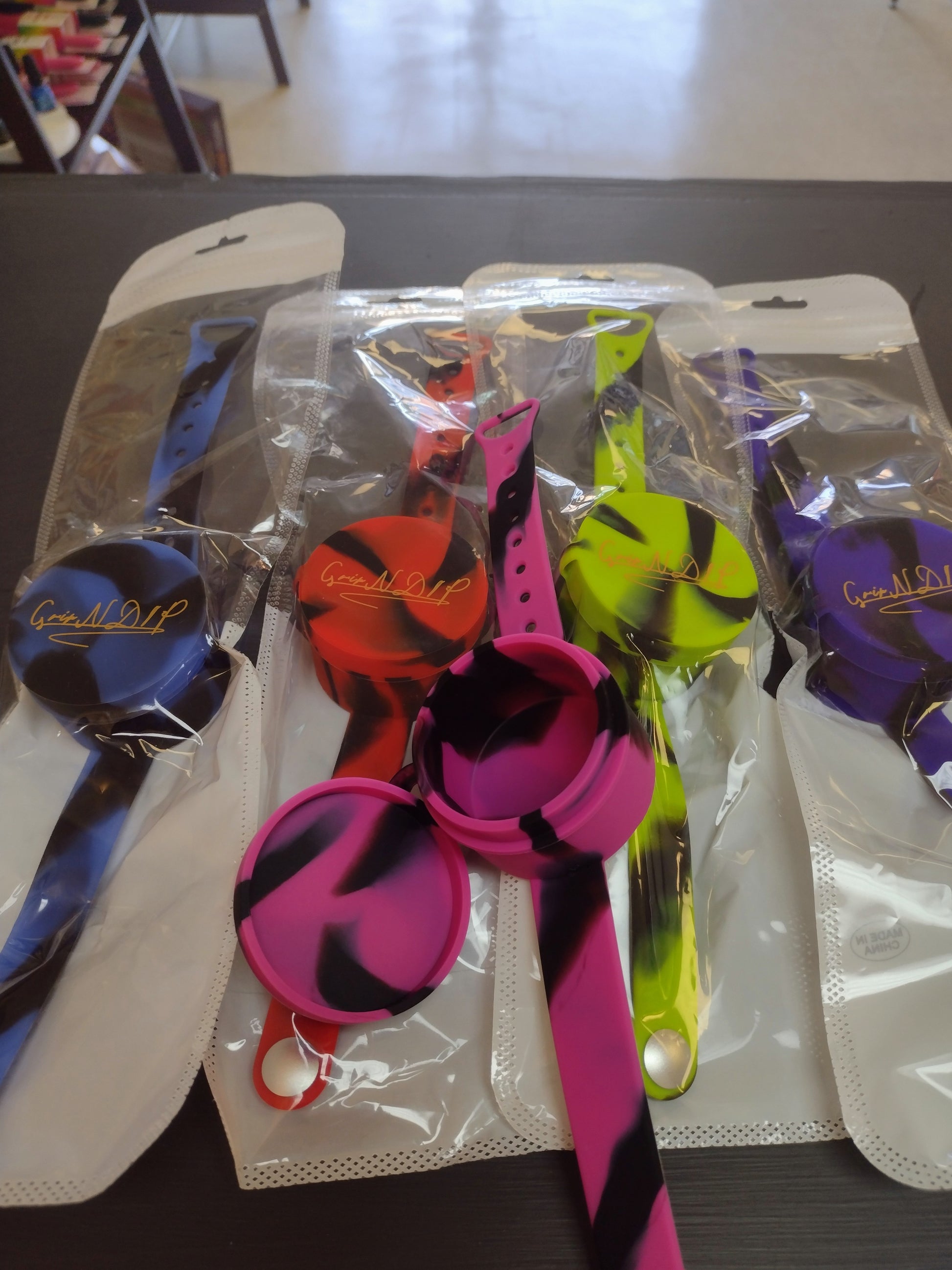 Grip-n-Dip wrist band is designed to hold gel, grease, or any hair product for hairstylist and braiders.